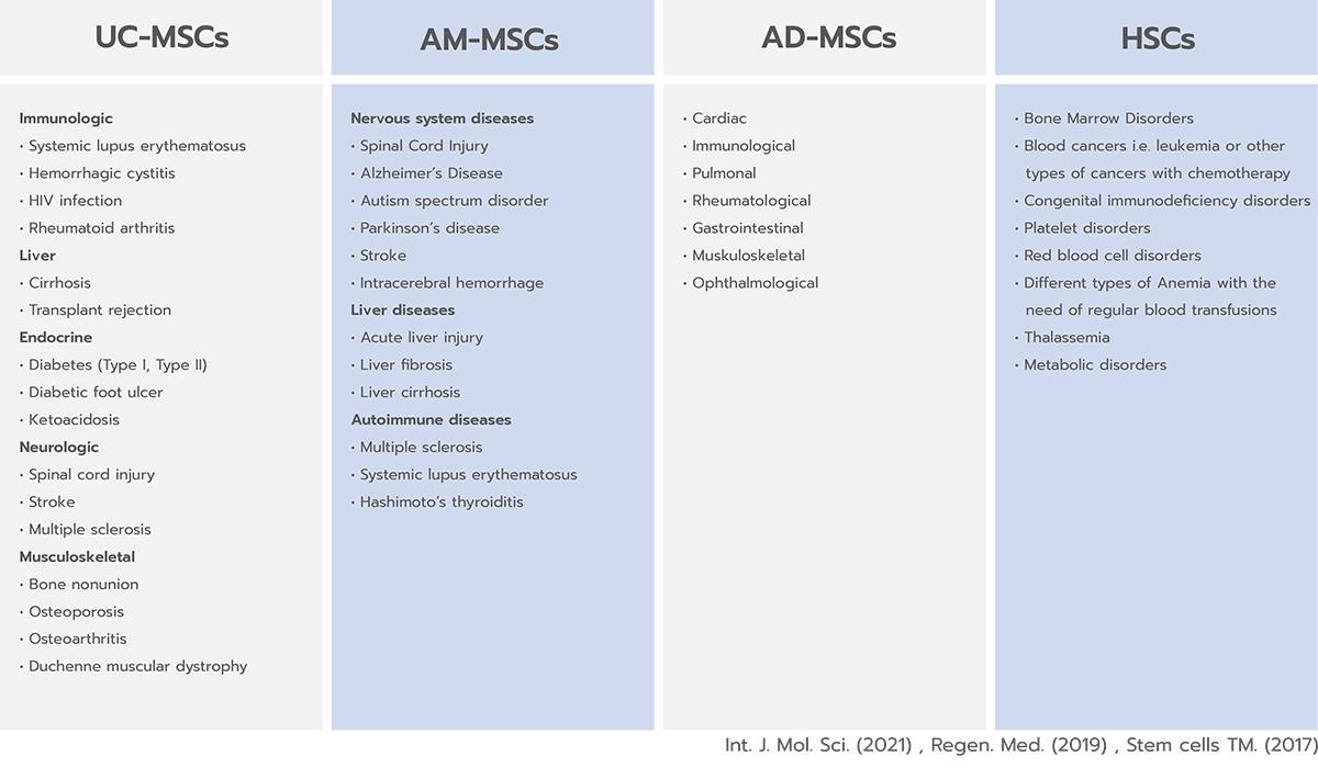 Indications treated by mesenchymal stem cell and Hematopoietic Stem Cell trials and publications.