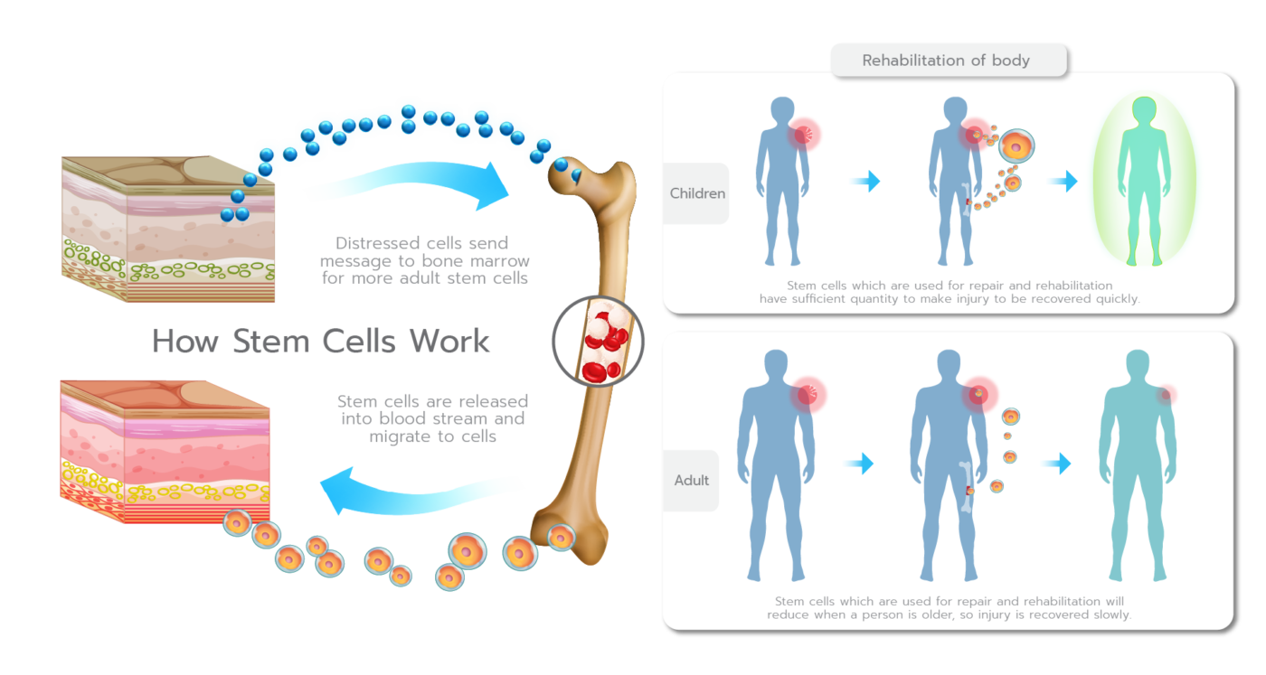 If our body can produce a lot of stem cells, then we will be old slowly; we will hardly be sick and when we are sick, we will recover quickly, because body can repair itself well, but when we are older, our body can produce stem cells less, so when we are sick, opportunity to recover will be difficult.