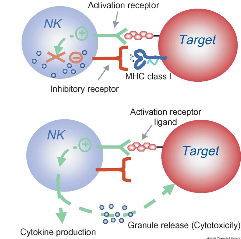 NK Cell Mechanism ถูกควบคุมการทำงานโดยตัวรับสัญญาณบนผิวของ NK Cell ที่จะมีทั้งตัวรับที่ส่งสัญญาณให้เกิดกระบวนการทำลายเซลล์เป้าหมายที่ผิดปกติ (Activating Receptors) และตัวรับที่ทำหน้าที่ยับยั้งการทำงาน (Inhibitory Receptors) ผลที่จะเกิดขึ้นอยู่กับการประมวลผลระหว่างสัญญาณกระตุ้นการทำงานและสัญญาณยับยั้งการทำงานบนผิวเซลล์